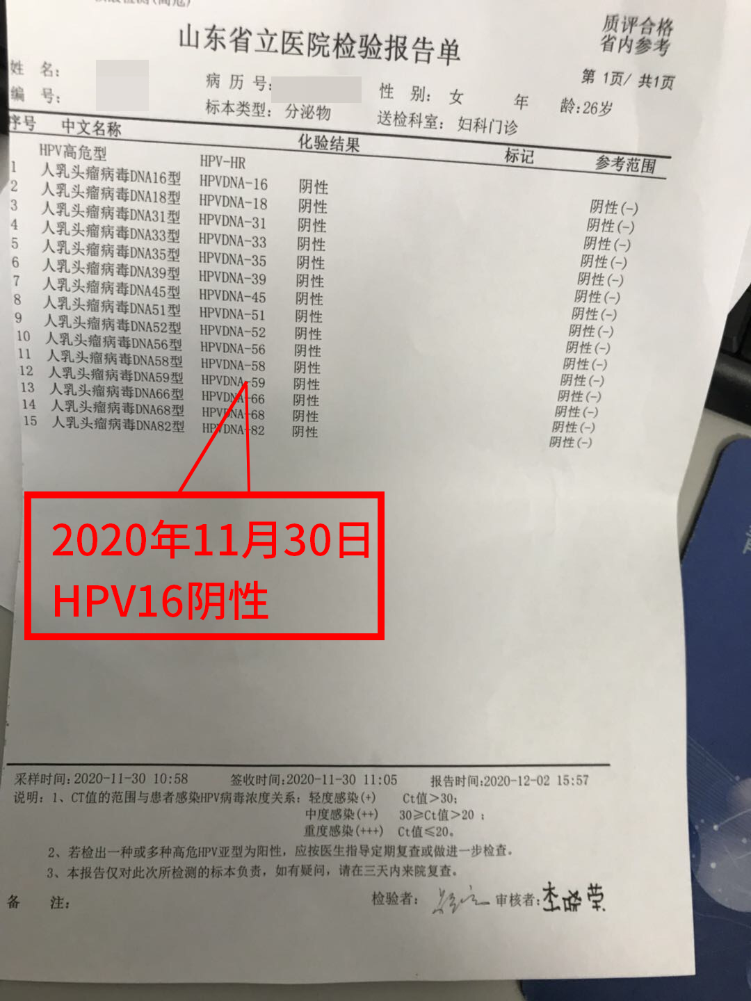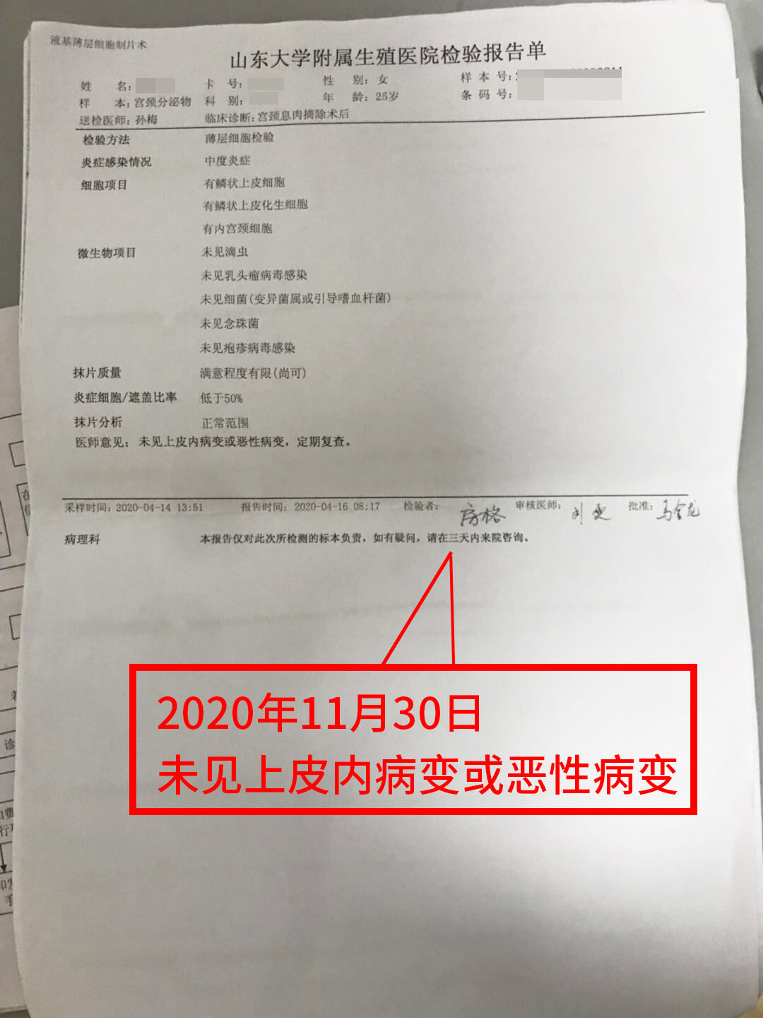 2020年(nian)11月30日復(fu)查:HPV檢(jian)測(ce):陰性,TCT:未見上(shang)皮內病(bing)(bing)變或惡性(xing)病(bing)(bing)變