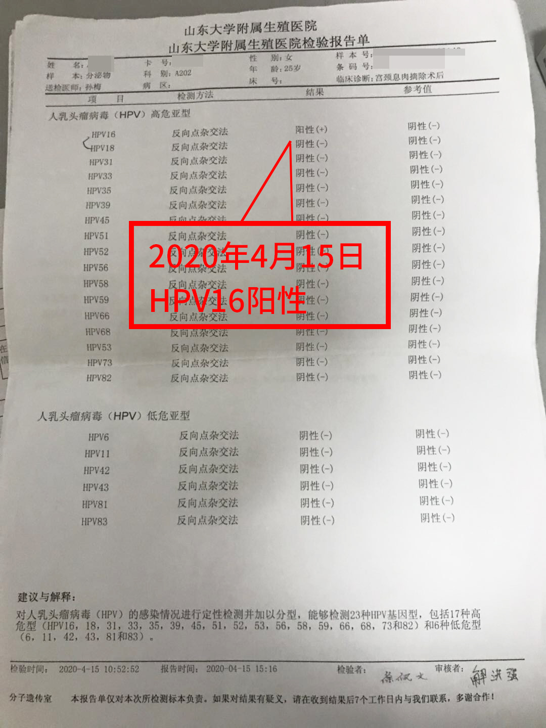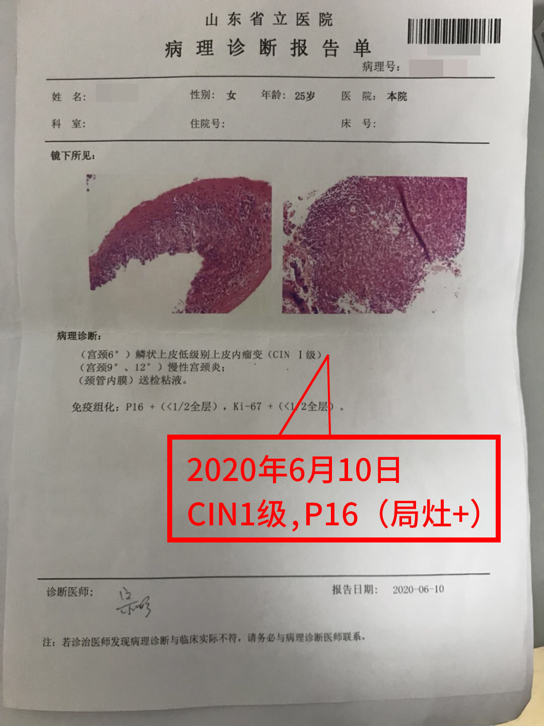 2020年4月確(que)診高危(wei)HPV16(+);2020年6月,病理診斷:宮頸6點LSIL(CIN1級)伴鱗(lin)狀上皮化生;