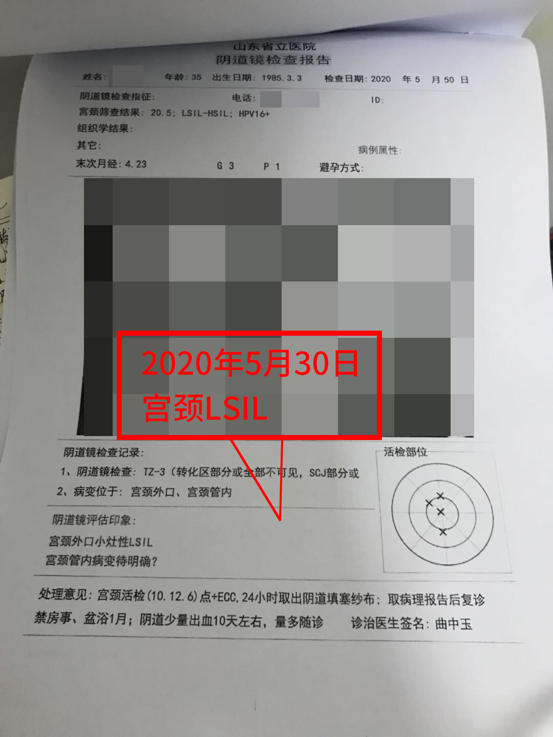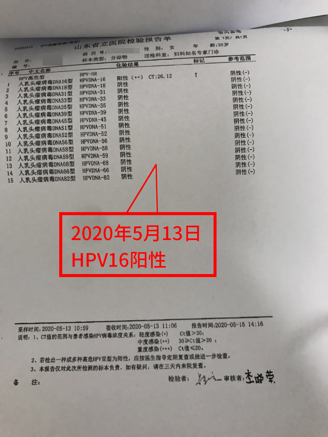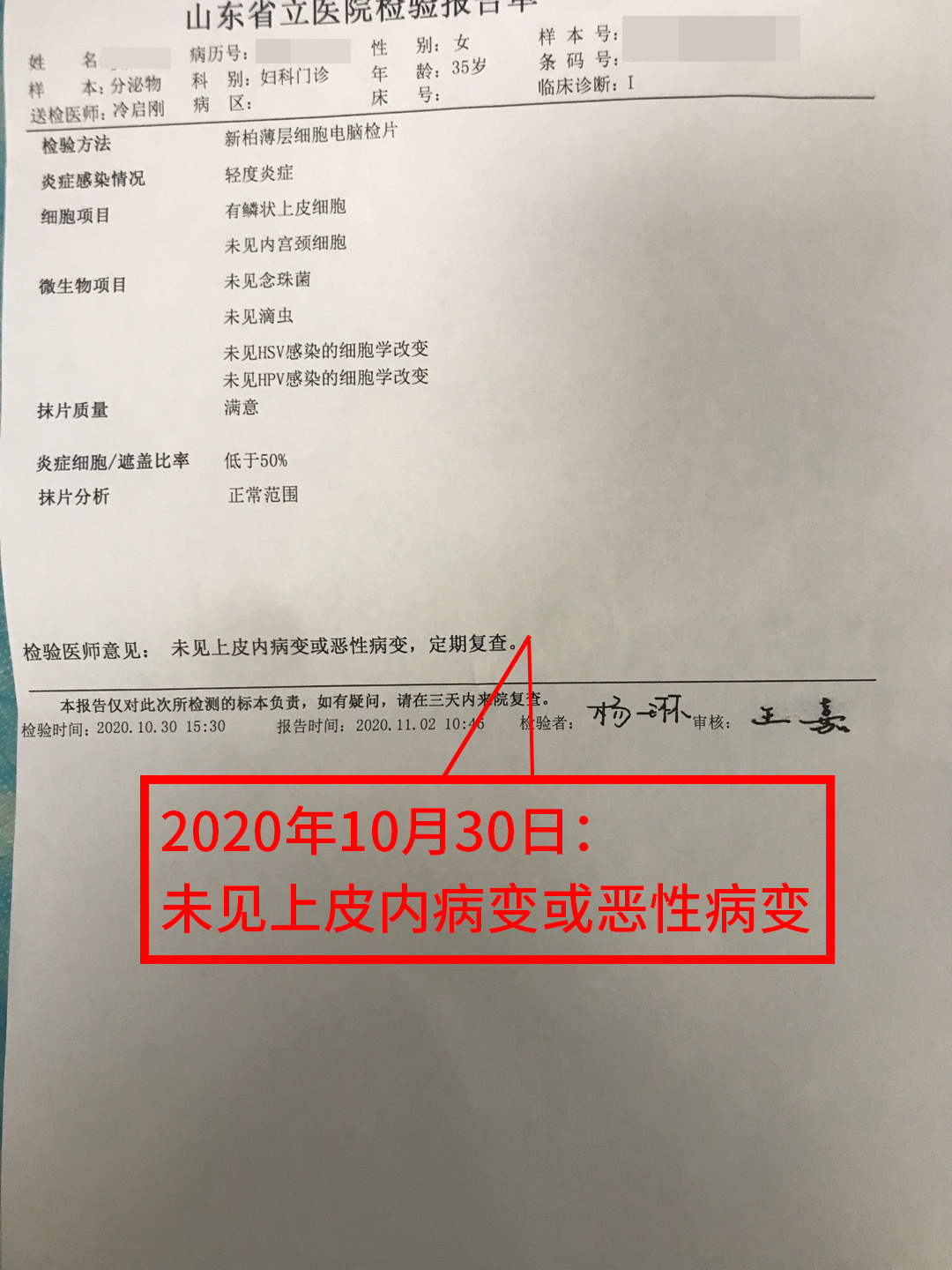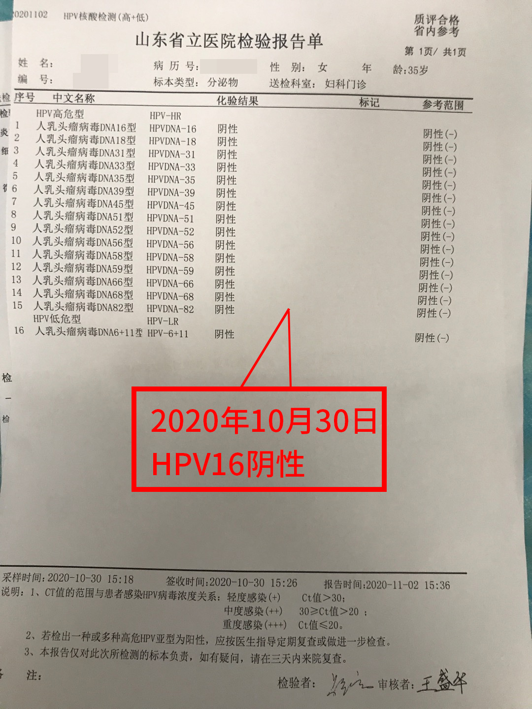 患者35歲,已(yi)(yi)婚(hun)已(yi)(yi)孕。確診高危HPV16(+);病理診斷:低級別上皮內病變;用紅卡(ka)一個療程方案進行(xing)治療;修復2個月復(fu)查(cha);復查:HPV檢測:陰性,TCT:未見上(shang)皮內(nei)病(bing)(bing)變或惡性病(bing)(bing)變