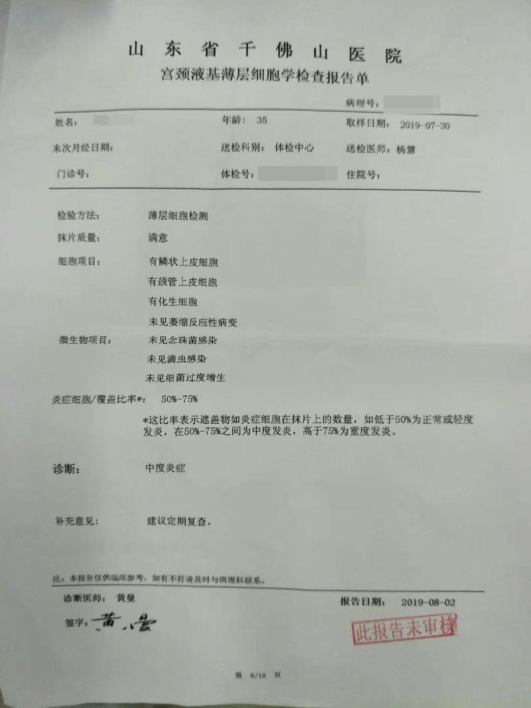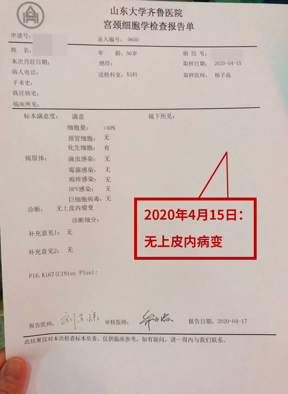 治療前(qian):高危(wei)HPV18(+)、CIN 1級,低級別鱗(lin)狀上皮(pi)內病(bing)變用(yong)紅卡一個療程方(fang)案進行治療,復查:HPV18陰性,TCT:無上皮(pi)內病變