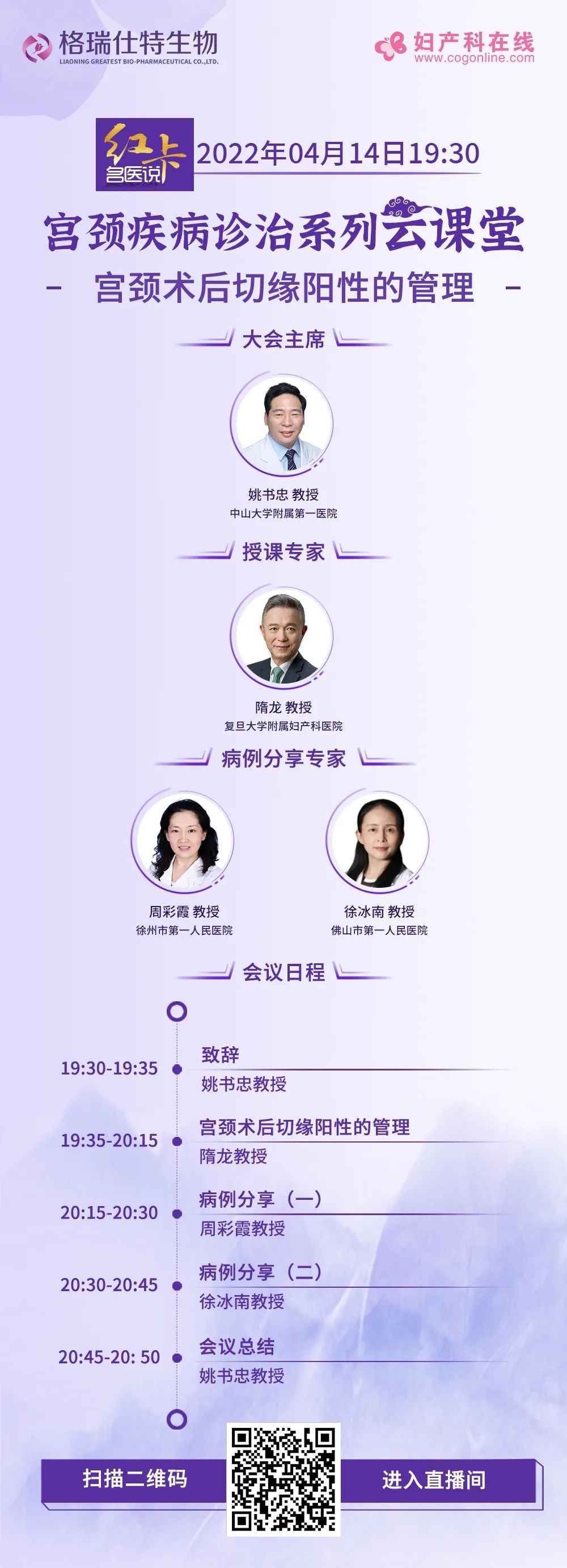 本期直播課程中,中山大學附屬***醫院姚書忠教授、復旦大學附屬婦產科醫院隋龍教授、徐州市***人民醫院周彩霞教授、佛山市***人民醫院徐冰南教授,將圍繞“宮頸術后切緣陽性的管理”展開深入探(tan)討,掃描下方二維(wei)碼或點擊文末閱讀原文即可參與觀看直播。