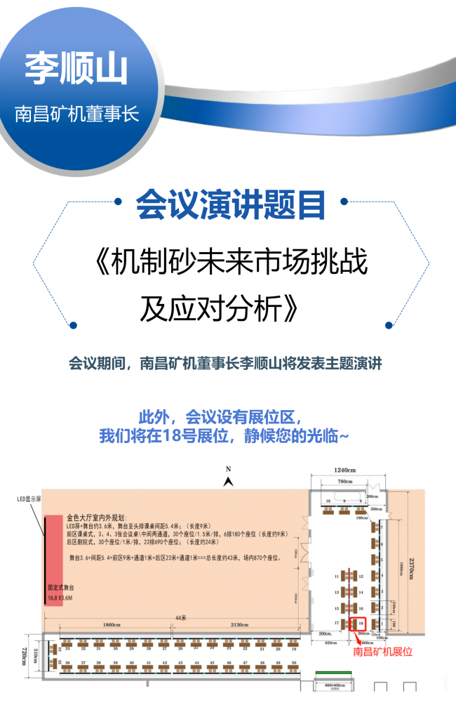 南昌礦機(jī)董事長李順山將出席會議,發(fā)表以《機(jī)制砂未來市場挑戰(zhàn)及應(yīng)對分析》為題的主題演講。會議設(shè)立集中展示區(qū),南昌礦機(jī)將在18號展位進(jìn)行企業(yè)展示,靜候您的光臨。