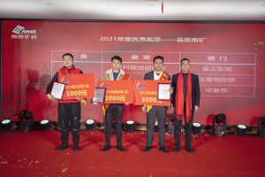 總結(jié)表彰大會上,南昌礦機(jī)為2021年度經(jīng)營發(fā)展做出突出貢獻(xiàn)的集體和個人進(jìn)行了表彰,先后頒發(fā)了《2021年度優(yōu)秀評選獎》科技南礦類、品質(zhì)南礦類、服務(wù)南礦類、國際南礦類、效益南礦類的優(yōu)秀團(tuán)隊及個人獎,“2021年度特別貢獻(xiàn)獎”,“南昌礦機(jī)2021年度金秋運(yùn)動會”團(tuán)隊及個人獎,進(jìn)行了2021年度快樂會議積分優(yōu)秀獎表彰和抽獎,開展了幸運(yùn)大抽獎及發(fā)紅包等活動,現(xiàn)場氣氛高漲不已。
